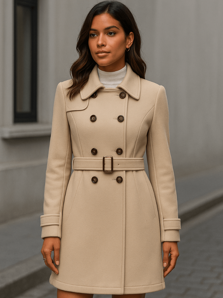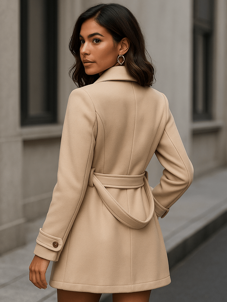 Com caimento regular e tecido 100% poliéster, o casaco proporciona um toque suave e agradável ao vestir. Sua modelagem com ajuste regular valoriza a silhueta sem abrir mão da liberdade de movimento. A lapela estilo blazer e os botões duplos garantem um visual refinado, enquanto o cinto ajuda a definir a cintura com charme.