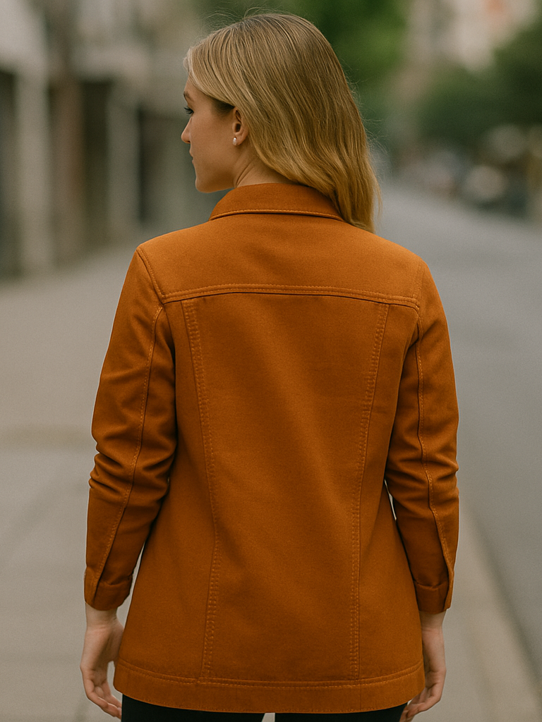 A jaqueta feminina jeans marrom é perfeita para meia estação e dias frescos. Mesmo sem forro, ela oferece proteção contra o vento, sendo uma escolha estilosa tanto para o outono quanto para as noites mais frias de primavera.